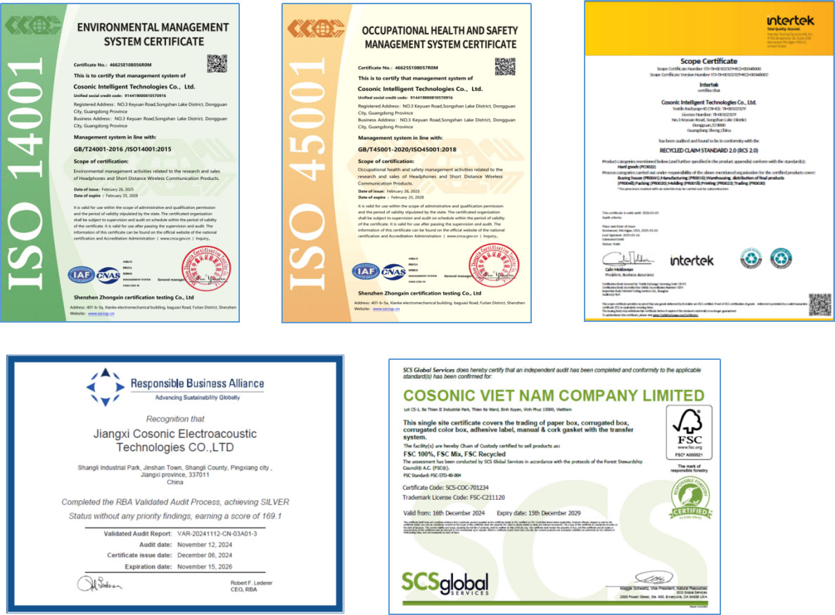 认证证书获取情况:公司已通过ISO14001、ISO45001、RCS、RBA、FSC等社会责任相关的认证。(注:以下只是部分工厂认证证书图片,集团旗下各子公司都有相关认证证书)